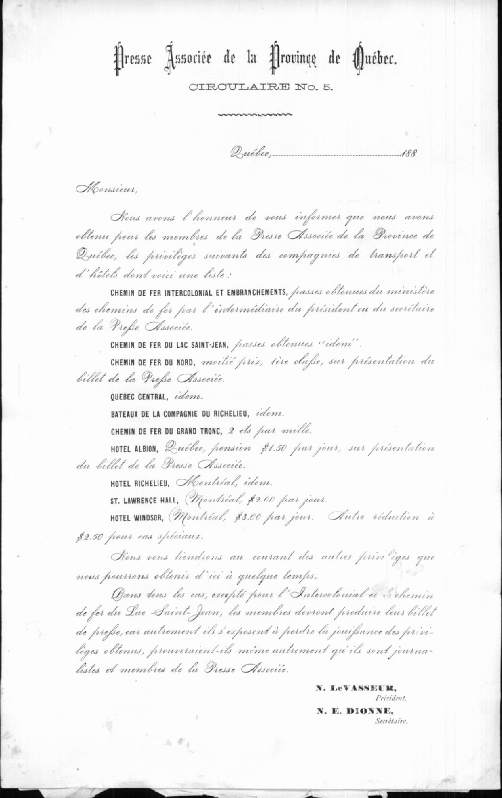 - Ce dossier comprend une circulaire (No 5) de la Presse associée de la province de Québec et une liste de ses membres. Dans le premier document, le président, N. LeVasseur, et le secrétaire, N. E. Dionne, informent les membres des privilèges offerts par des compagnies de transport et des hôtels (passes de transport ou tarifs réduits dans les hôtels) et en donnent la liste. Quant au deuxième document, c'est une liste officielle des cinquante-cinq membres de l'association, signée à Québec, le 5 mai 1883, par son président N. LeVasseur et son secrétaire, N. E. Dionne