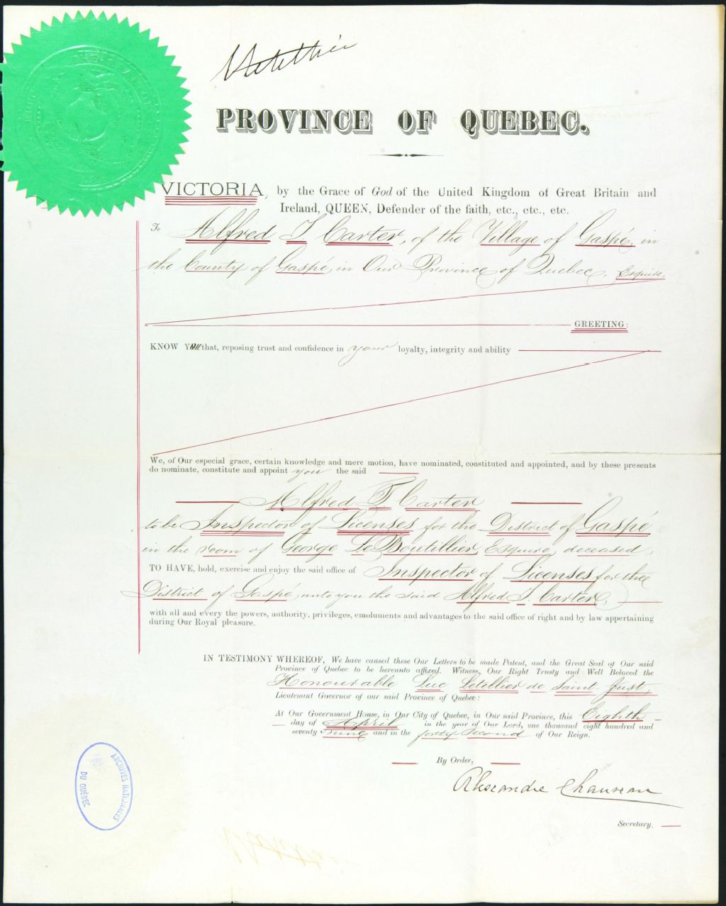 - Ce dossier est composé d'une nomination d'Alfred Cartier comme inspecteur des licences pour le district de Gaspé