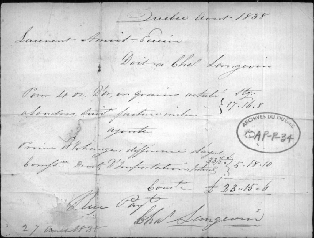 - Ce dossier est composé d'un état de compte envoyé à Laurent Amiot (1764-1839), orfèvre à Québec, par Charles Langevin en 1828
