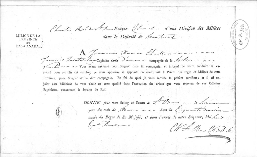 Ce dossier est entre autres composé des documents suivants: quatre commission dans la milice, 1812-1831. 4 pages (copies xérox); rôles de la compagnie du capitaine F.-X. Chagnon pour la division de Verchères, 1827, 1828, 1829, 1831, 1832, 1833, 1835, 1836, 1837, 1838 (copies xérox); rôle de la compagnie du capitaine Paschal Chagnon pour la division de Verchères, 1822. 8 pages (copies xérox)