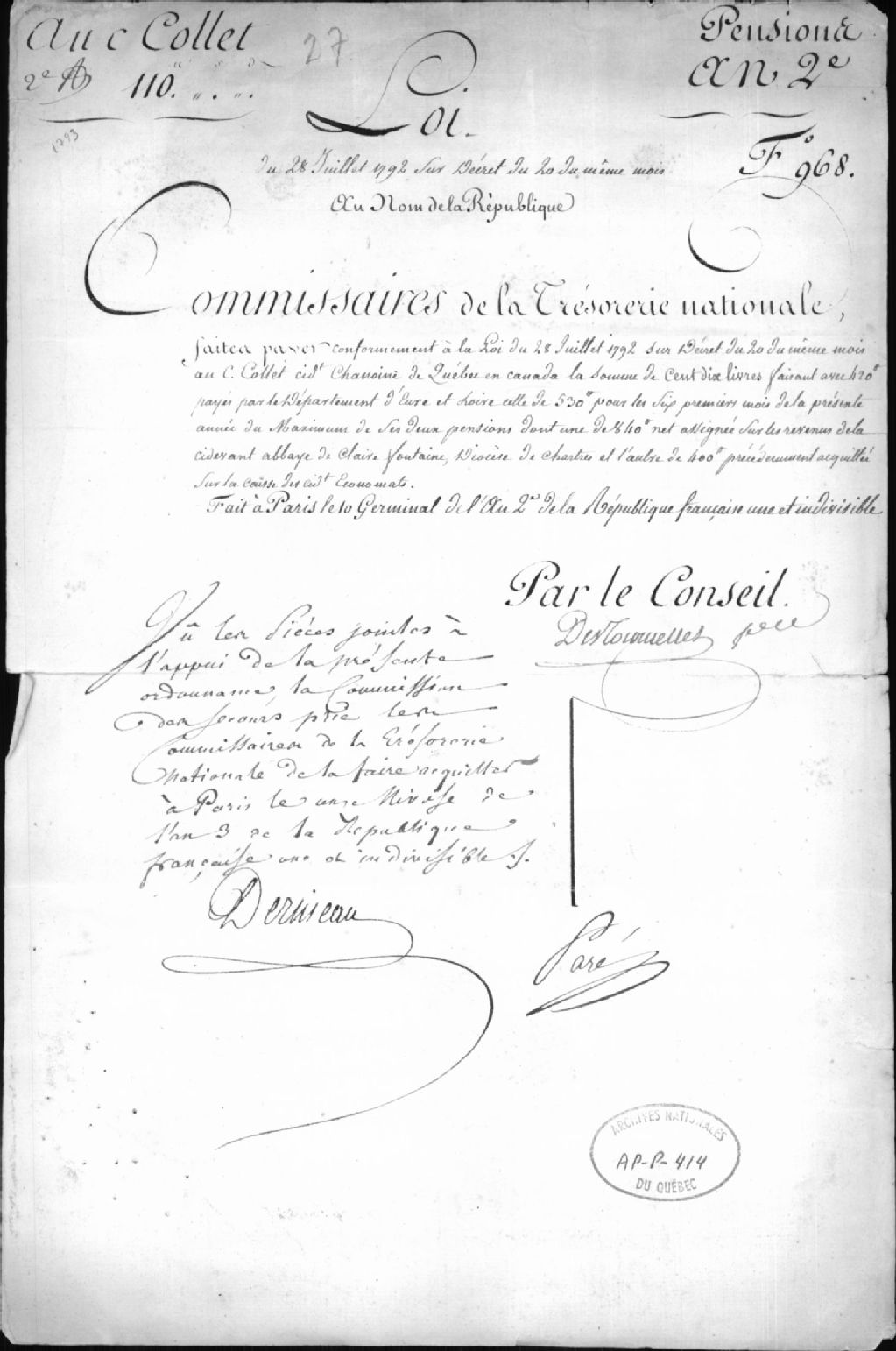 Pension pour le Chanoine Charles-Ange Collet, 28 juillet 1792, Archives nationales à Québec, Collection Centre d'archives de Québec, (03Q,P1000,S3,D414).
