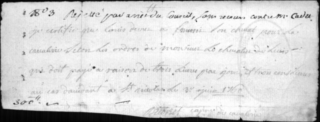 Ce dossier est constitué d'un reçu - à St-Nicolas, 3 juin 1760 - dans lequel Delbrest certifie que Louis Demers a fourni son cheval pour la Cavalerie selon les ordres du Chevalier de Lévis, qui doit payer trois livres par jour et 300 livres en cas d'accident. Cette demande a été rejetée par arrêt du Conseil, sans recours contre le sieur Cadet en 1803
