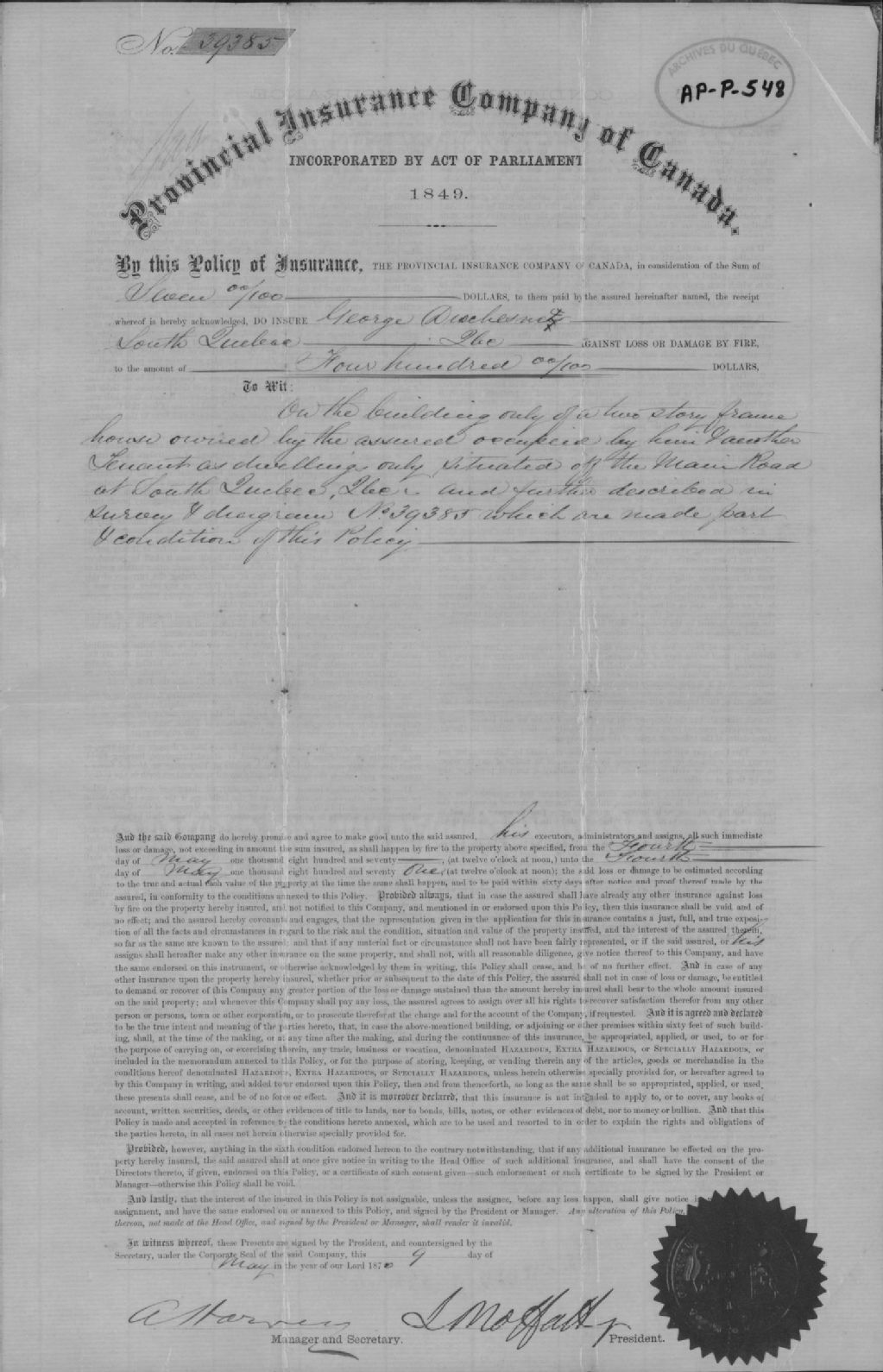 - Ce dossier est composé d'une police d'assurance de la Provincial Insurance Company of Canada décernée à George Deschesnes