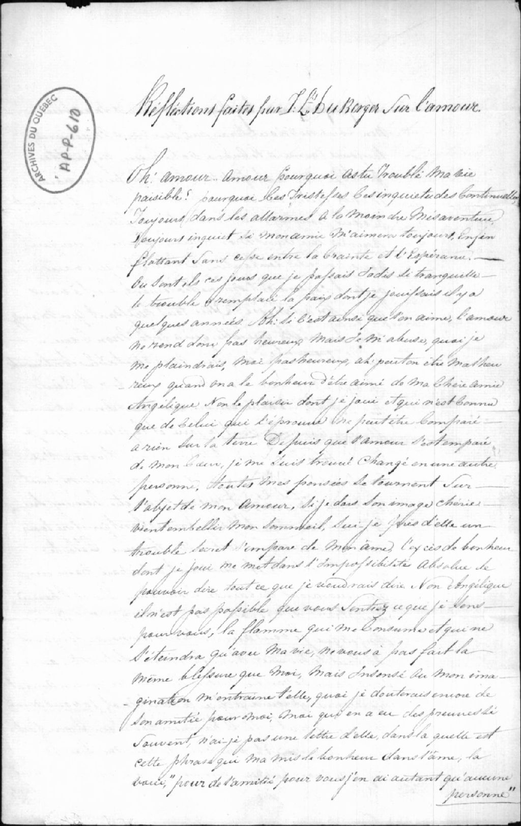 Ce dossier contient une copie manuscrite intitulée « Réflections faites par T.-L. Duberger sur l'amour », signée à Québec par T.-L. Duberger