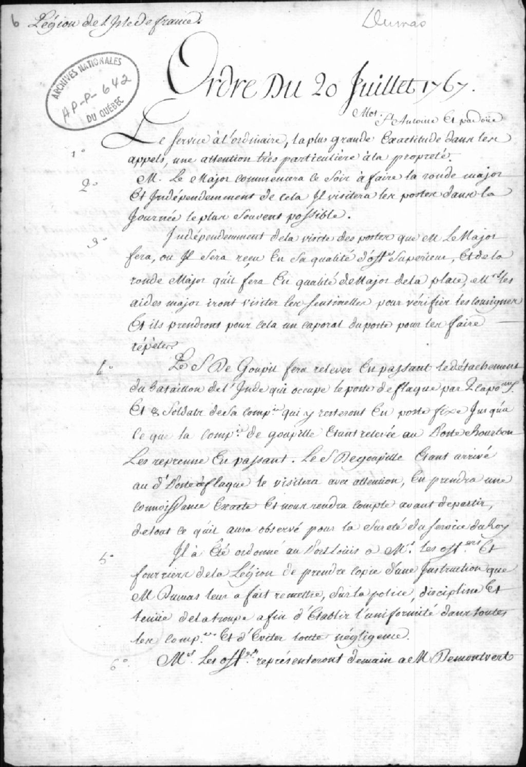 - Ce dossier est composé de la copie manuscrite d'ordres à la Légion de l'Isle de France rédigés par un secrétaire et mais signés par Dumas