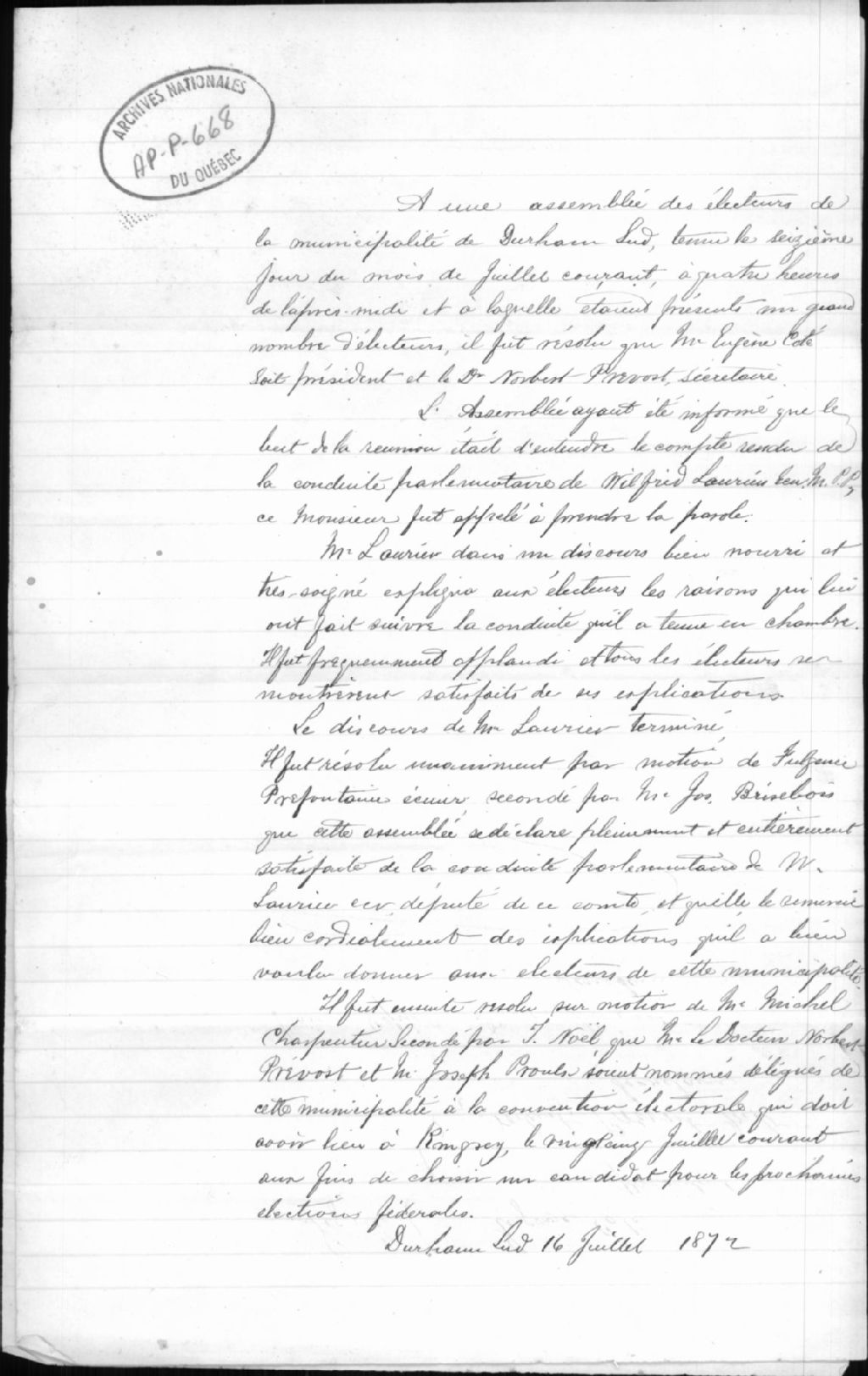 - Ce dossier contient une copie manuscrite d'un compte rendu d'une assemblée des électeurs de la municipalité Municipalité de Durham-Sud concernant la conduite parlementaire de Wilfrid Laurier