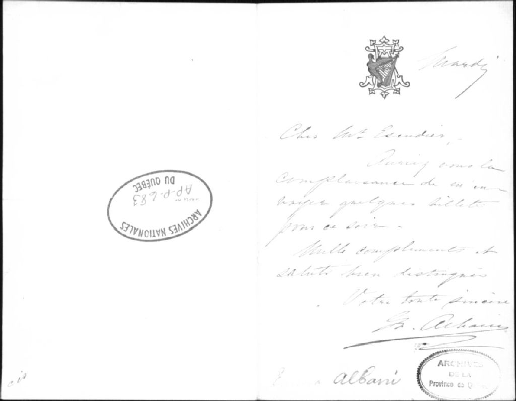 Lettre de Emma Albani à Monsieur Escudier, [Vers 1900], Archives nationales à Québec, Collection Centre d'archives de Québec, (03Q,P1000,S3,D683).