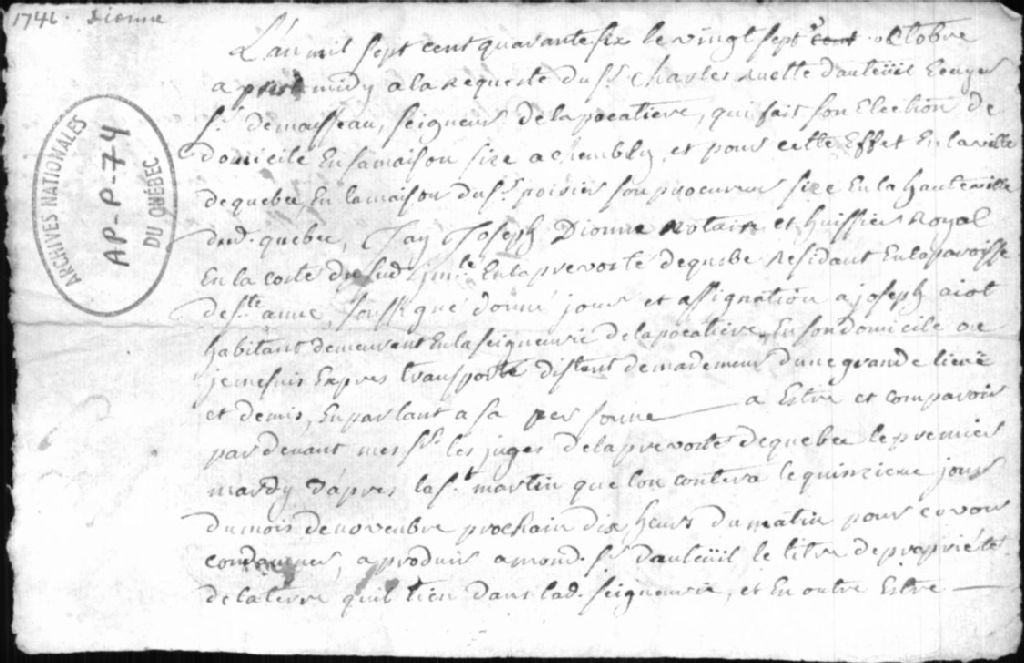 - Ce dossier est composé d'une sommation à Joseph Ayotte à comparaître devant la Prévôté de Québec pour payer ses arrérages à Charles Ruette d'Auteuil, signée de l'huissier Dionne