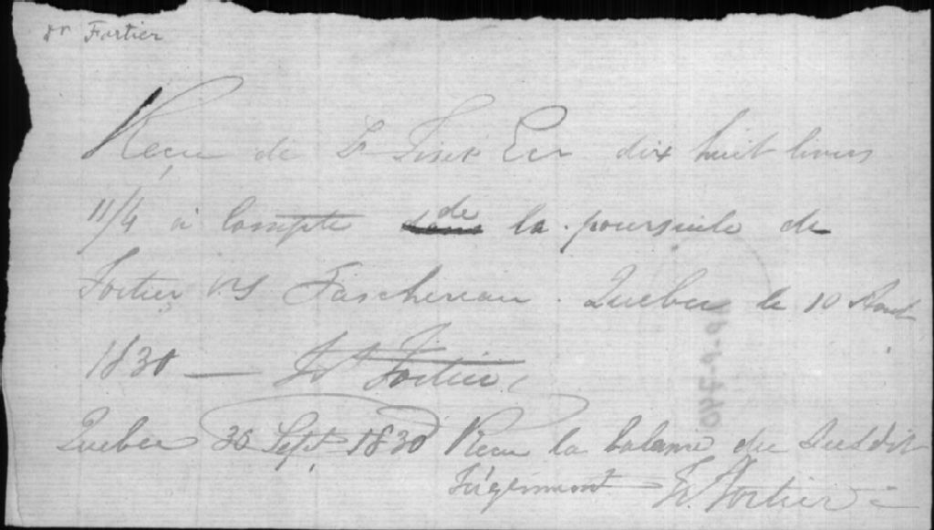 - Ce dossier est constitué d'un document dans lequel le docteur François Fortier certifie avoir reçu de Louis Fiset la somme et de la poursuite Fortier contre le juge Taschereau