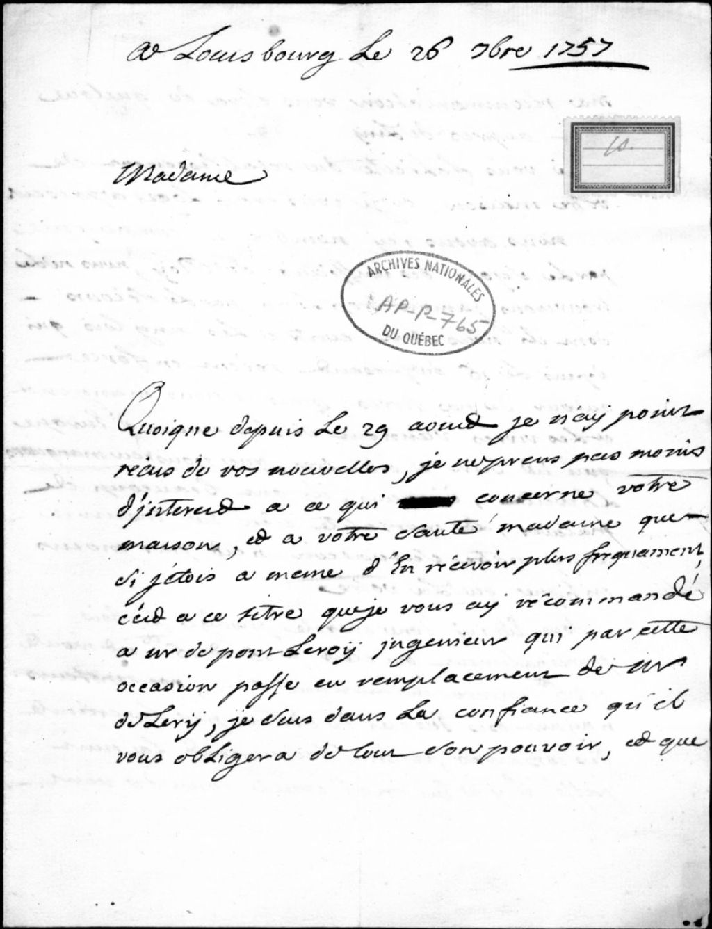 - Ce dossier est constitué d'une lettre adressée à une dame lui donnant des nouvelles de la vie à Louisbourg (Original et copie dactylographiée)