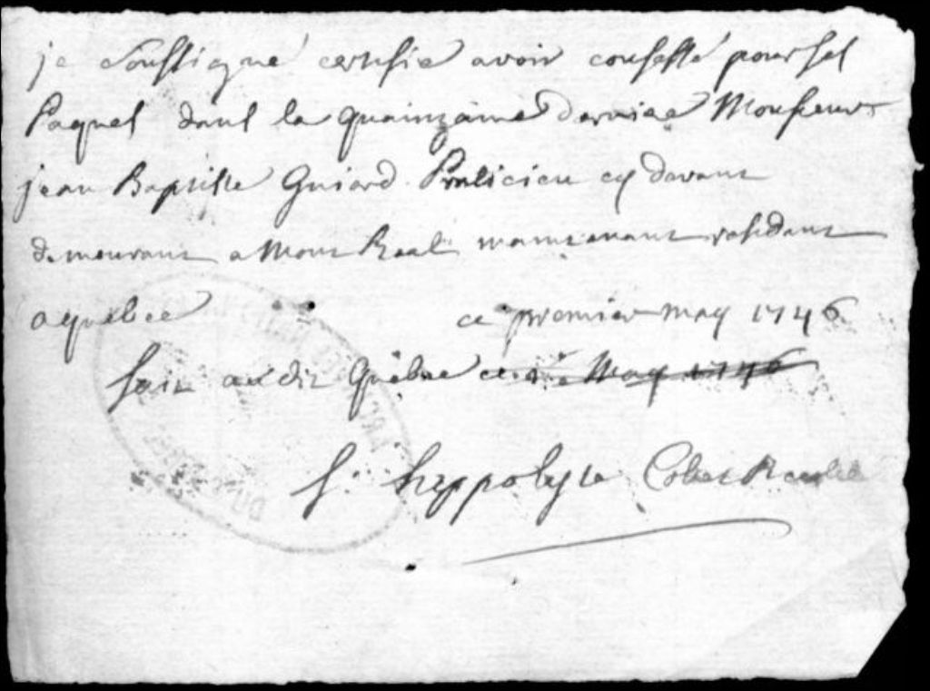 Certificat de confession pascale de Jean-Baptiste Girard, 1 mai 1746, Archives nationales à Québec, Collection Centre d'archives de Québec, (03Q,P1000,S3,D868).