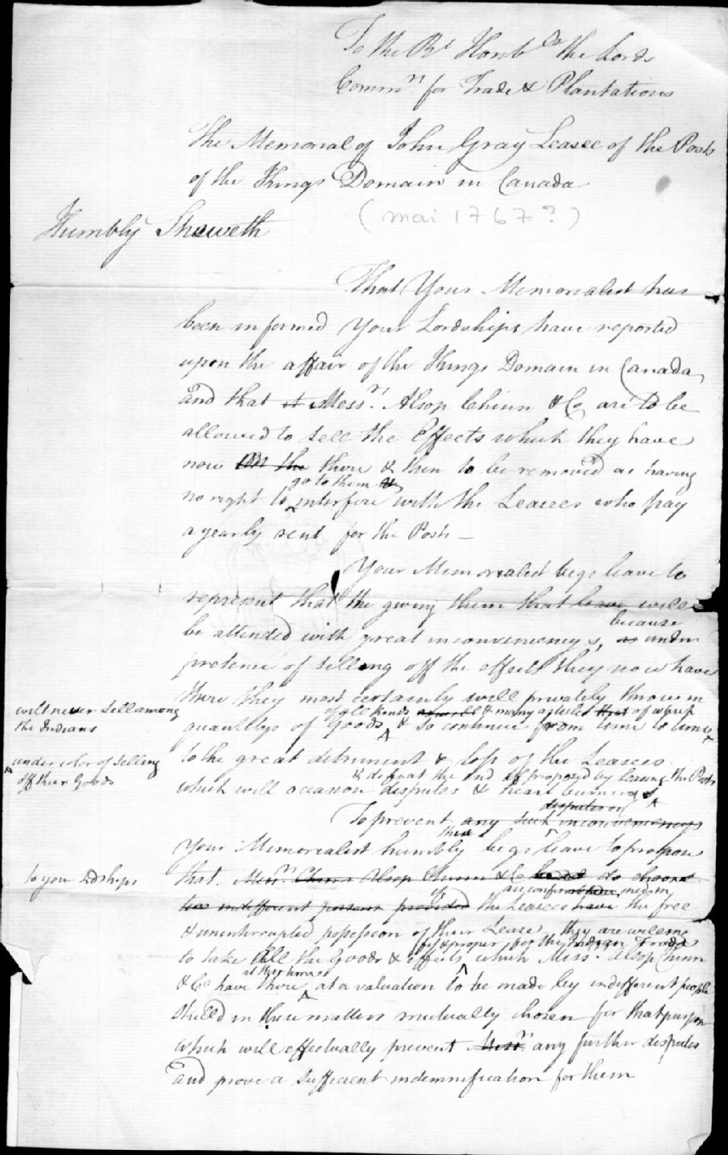 - Ce dossier est constitué de protestations des locataires des Postes du roi, Québec, c.1767, d'une citation pour John Gray, Montréal 1780