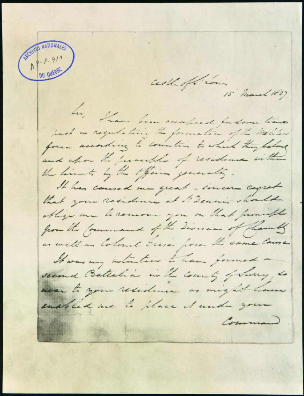 - Ce dossier est constitué d'une lettre de Lord Dalhousie: il enlève le commandement de Chambly au Lt-colonel Guérout, en format photostat