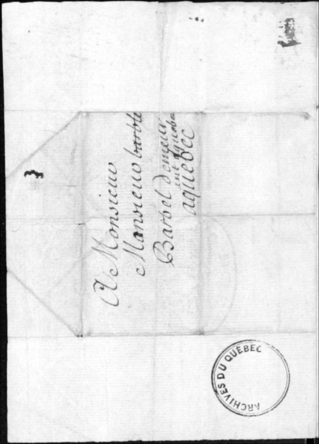 - Ce dossier est composé des documents suivants: lettre de J.-Bte Dufresne à M. Barbel, notaire royal et secrétaire de Bégon, « un petit mémoire vestimentaire pour son usage immédiat », non daté; procuration totale de la veuve de la Valtrie (Louise Brisot) au sieur Barbel, 3 oct. 1704; lettre du frère Becquet au notaire Barbel concernant une pension, 23 juin 1709; lettre de Jacques Daneau de Muy au notaire Barbel pour la succession d'Auteuil, 5 sept. 1738; lettre de Robert Dumont, curé de Neuville, à Barbel pour avertir M. d'Auteuil que son fermier vient de mourir, 2 mai 1739; lettre de Barbel à une cliente, 14 juil. 1739: il lui envoie les papiers qu'elle réclame et établit le compte de la somme qu'elle lui doit