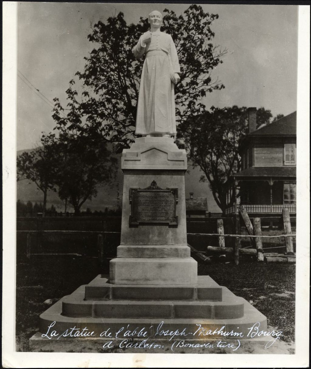 La statue de l'abbé Joseph-Mathurin Bourg à Carleton, Bonaventure, 1923, Archives nationales à Québec, Collection Centre d'archives de Québec, (03Q,P1000,S4,D19,P179), Photographe non identifié.