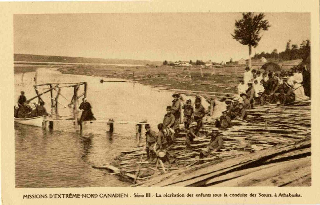 Mission d'Extrême-Nord Canadien, série 3, La récréation des enfants sous la conduite des Soeurs à Athabaska (Athabasca), [vers 1915], Archives nationales à Québec, Collection Centre d'archives de Québec, (03Q,P1000,S4,D31,P23), Photographe non identifié.