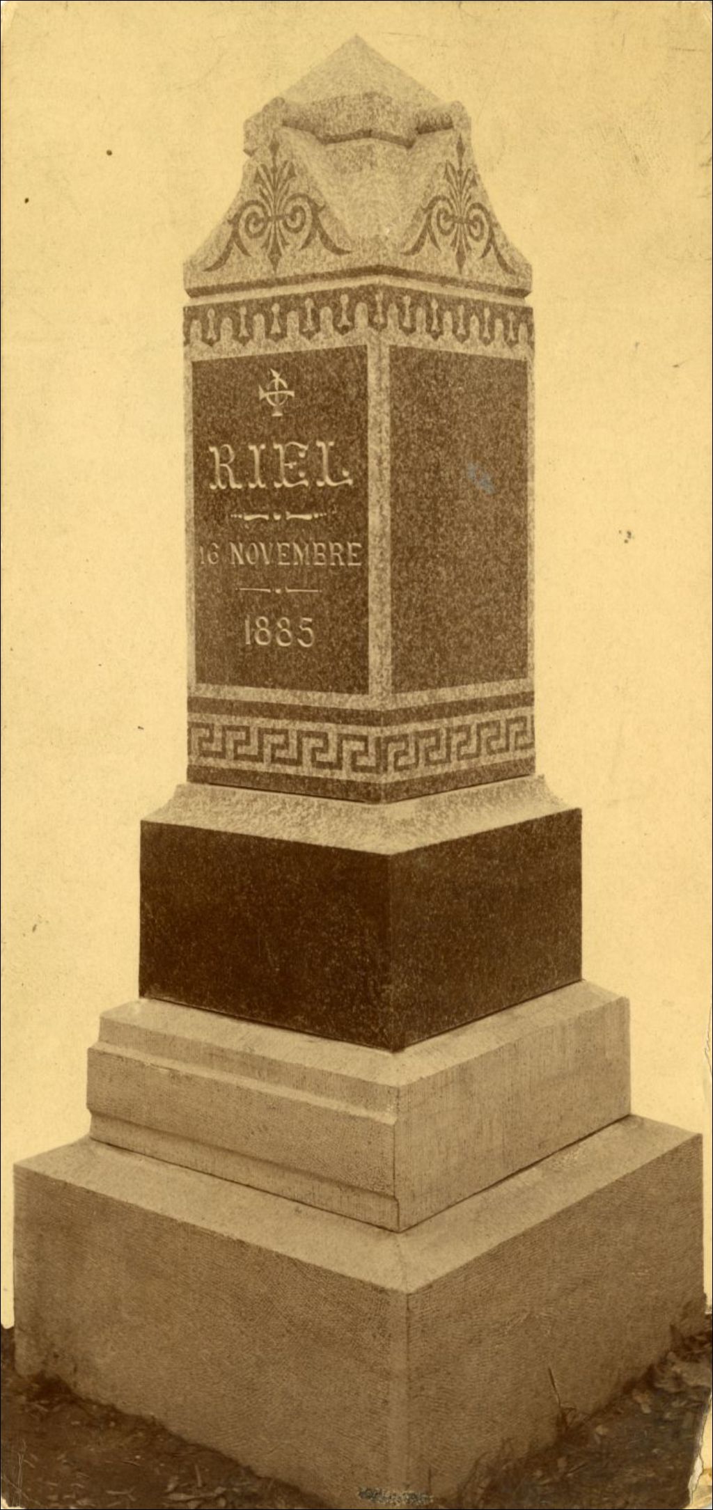 Monument érigé en l'honneur du chef métis Louis Riel, [Vers 1890], Archives nationales à Montréal, Fonds Famille Mercier, (06M,P74,S8,SS2,SSS4,P1), Photographe non identifié.