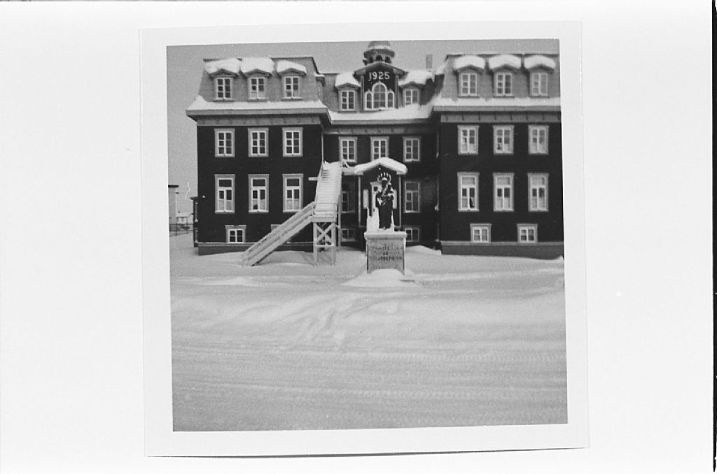 Démolition du couvent Saint-Joseph à Havre-Saint-Pierre, Négatif reproduit en 1983(original créé en 1967), Archives nationales à Sept-Îles, Fonds Société historique de Havre-Saint-Pierre inc, (09N,P19,S1,SS1,P245), Société historique de Havre Saint-Pierre.