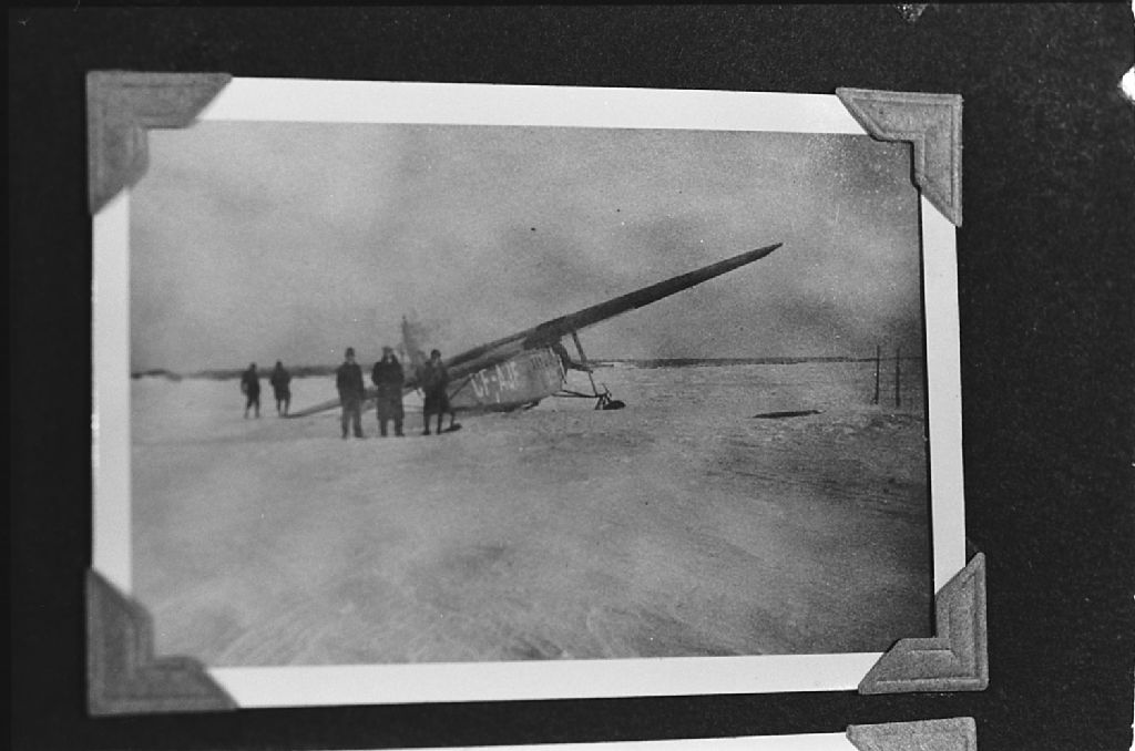 Atterrissage forcé d'un avion transportant le courrier à Port-Menier, Anticosti, Négatif reproduit en 1983(original créé en 1928), Archives nationales à Sept-Îles, Fonds Société historique de Havre-Saint-Pierre inc, (09N,P19,S1,SS1,P337), Société historique de Havre Saint-Pierre.