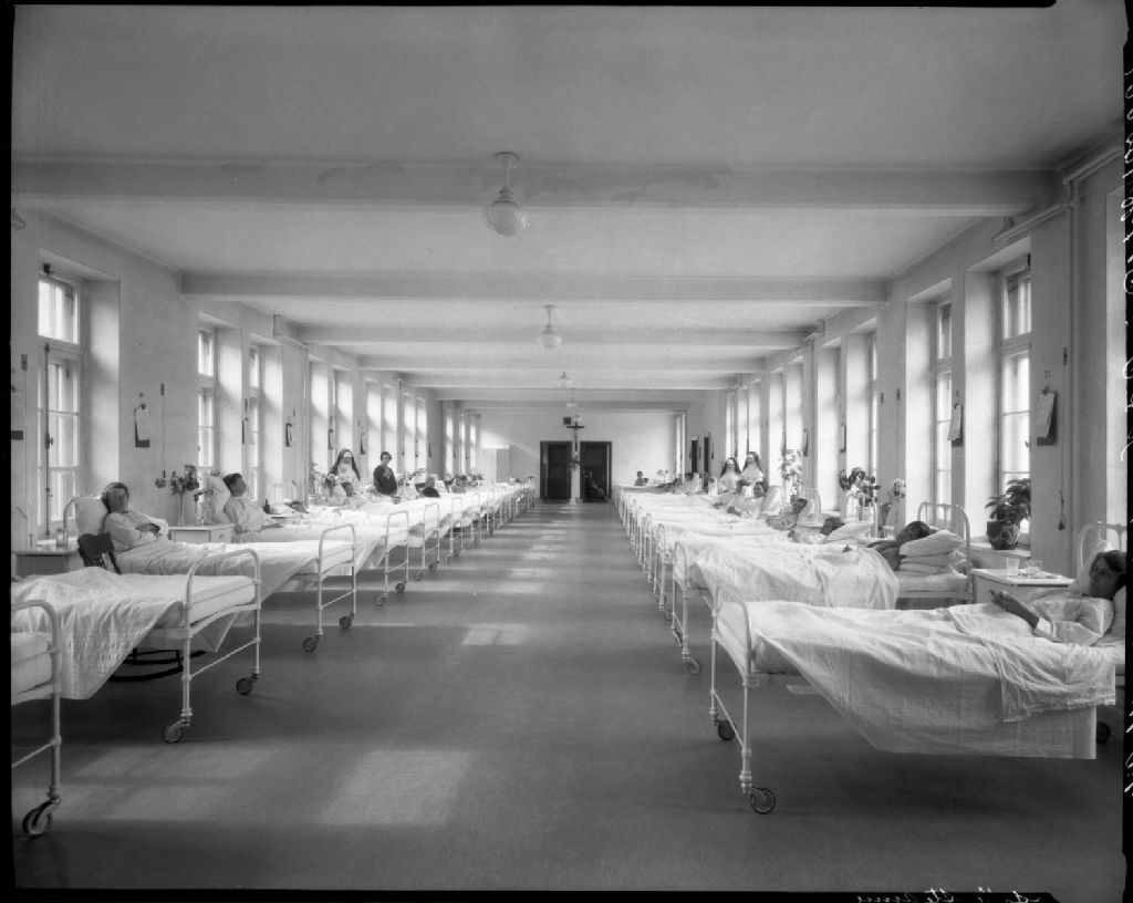 Chambre des malades de l'hôpital Hôtel-Dieu du Précieux Sang de Québec, [Vers 1925], Archives nationales à Québec, Fonds J. E. Livernois Ltée, (03Q,P560,S2,D2,P122001-17), Photographe non identifié.