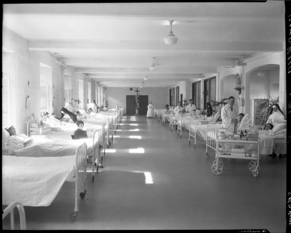 Chambre des malades de l'hôpital Hôtel-Dieu du Précieux Sang de Québec, [Vers 1925], Archives nationales à Québec, Fonds J. E. Livernois Ltée, (03Q,P560,S2,D2,P122001-21), Photographe non identifié.