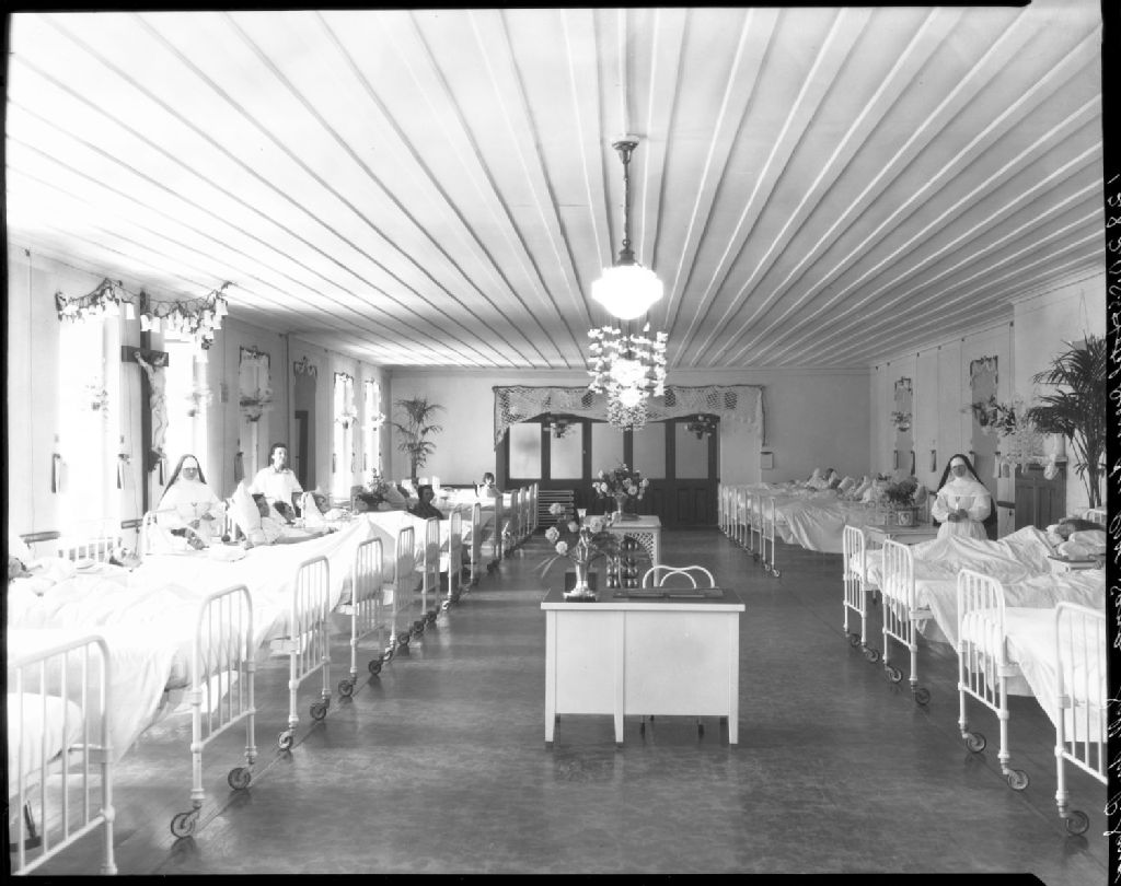 Chambre des malades de l'hôpital Hôtel-Dieu du Précieux Sang de Québec, [Vers 1925], Archives nationales à Québec, Fonds J. E. Livernois Ltée, (03Q,P560,S2,D2,P128205-5), Photographe non identifié.