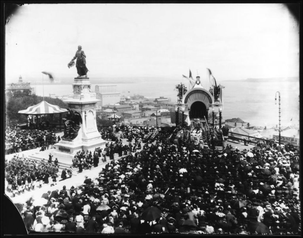 Rassemblement près du monument de Samuel de Champlain pour la messe en plein air lors de la fête de la Saint-Jean-Baptiste ., 1902, Archives nationales à Québec, Fonds J. E. Livernois Ltée, (03Q,P560,S2,D2,P87088), Photographe non identifié.