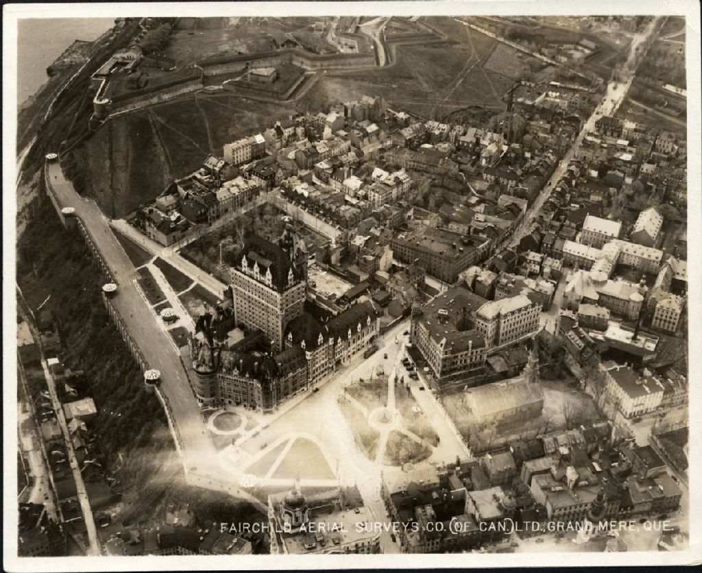 Sur cette photographie aérienne de Québec, on voit une partie de la Haute-Ville, la terrasse Dufferin, le Château Frontenac, le bureau de poste, le Palais de justice, la rue Saint-Louis, une partie de la Citadelle, le bastion du Roi et la Porte Saint-Louis