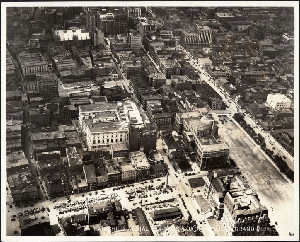 Sur cette photographie aérienne, on voit une partie de la ville de Montréal, la PLace Jacques-Cartier, l'hôtel de ville, la palais de justice, les édifices de La Sauvegarde, compagnie d'assurance, l'édifice de La Presse et la basilique Notre-DAme