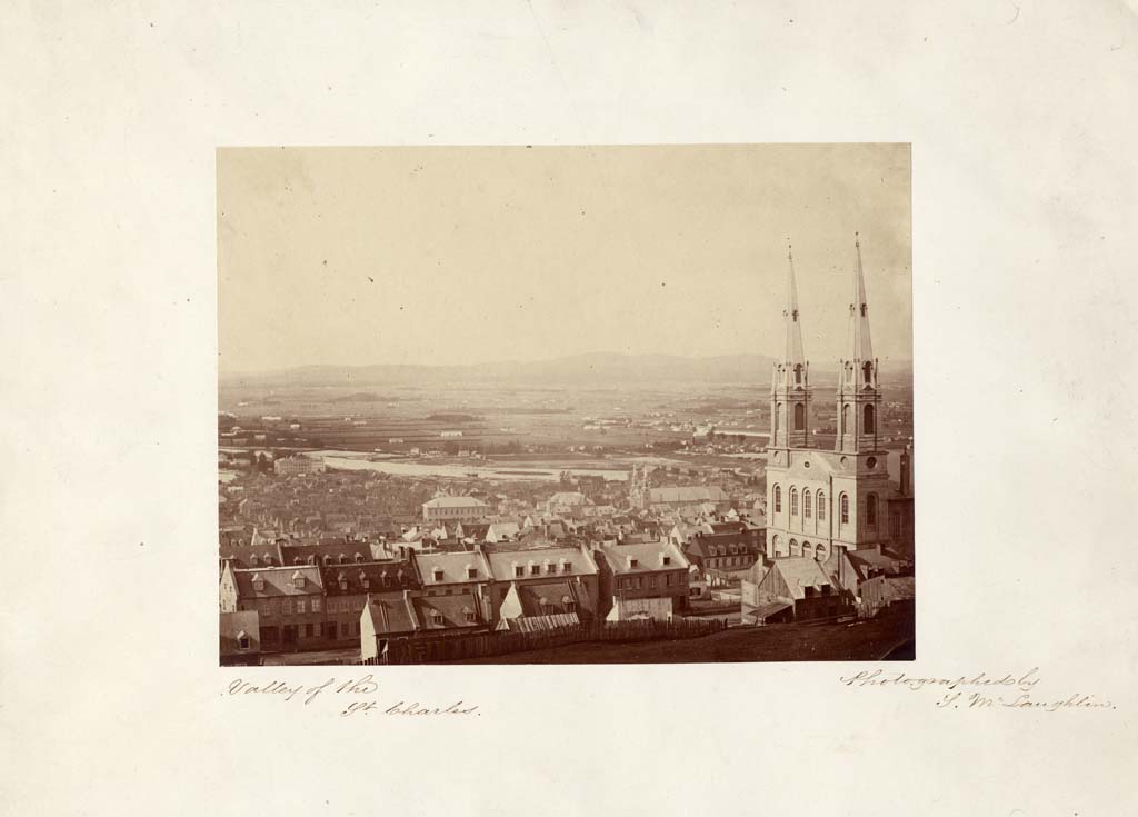 Quartier Saint-Jean-Baptiste - Rue Saint-Jean - Vue panoramique en plongée vers le coteau Sainte-Geneviève, l'église Saint-Jean-Baptiste, l'église Saint-Roch, les halles Jacques-Cartier, l'hôpital de la Marine et la rivière Saint-Charles