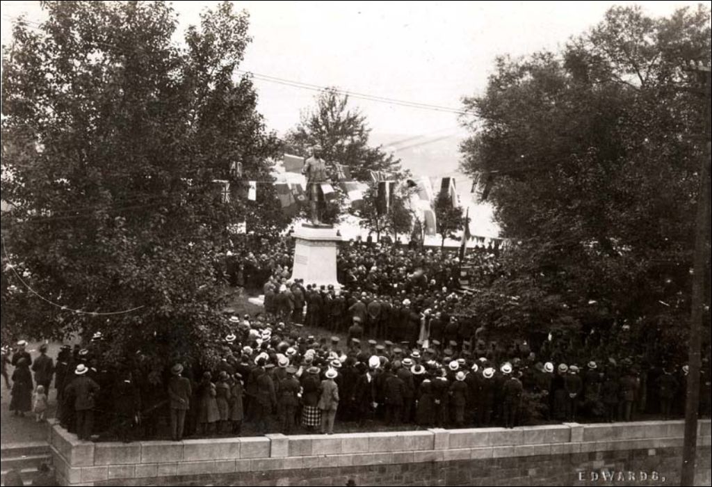 Quartier Vieux-Québec - Côte de la Montagne - Parc Montmorency - Dévoilement du monument Cartier - Vue éloignée de la foule autour du monument