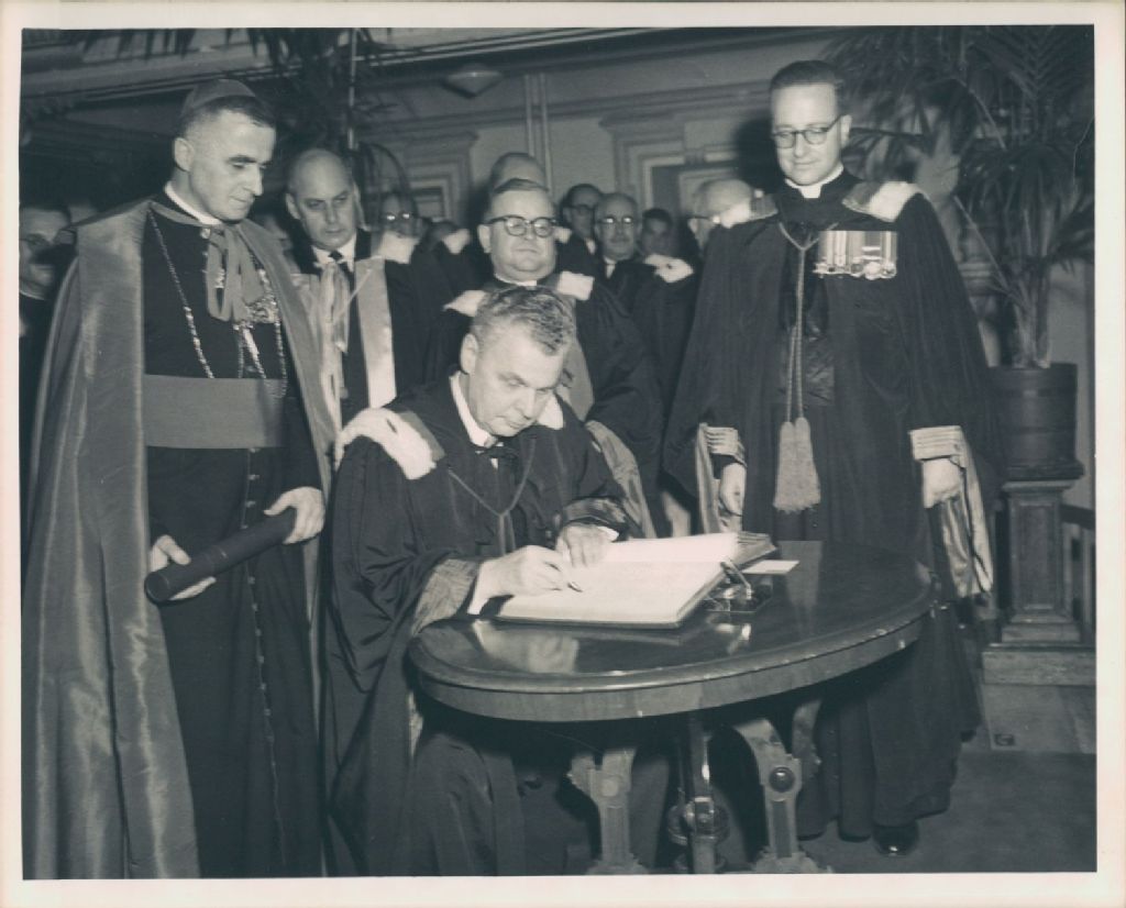 John G. Diefenbaker honoré par l'université Laval en présence des Monseigneurs Maurice Roy, Alphonse-Marie Parent et Jacques Garneau
