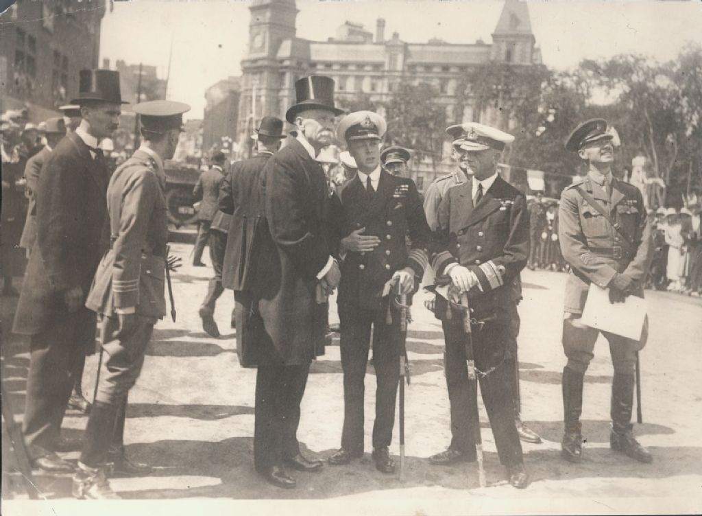 Le prince de Galles futur Édouard VIII en conversation avec sir George Garneau face au monument Champlain