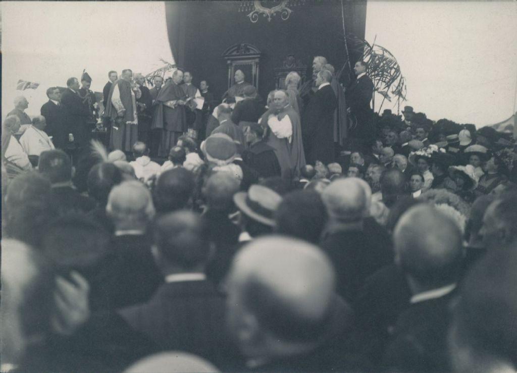 Vue rapprochée de l'estrade officielle installée près de l'hôtel pendant un discours fait par Louis-Nazaire Bégin à Vincent Vanutelli