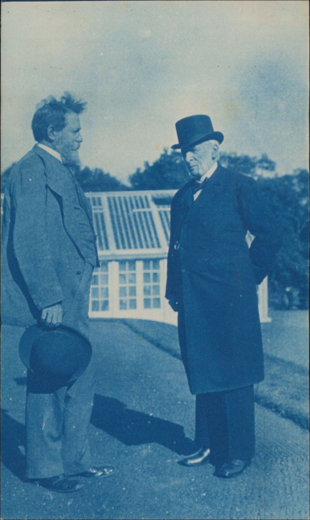 Vue rapprochée de Sir James McPerson LeMoine et George Moore Fairchild, sur le parterre, proche de la serre