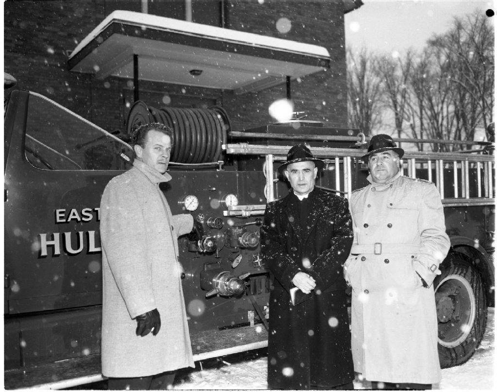 Camion d'incendie à Limbour, 23 décembre 1962, Archives nationales à Gatineau, Fonds Champlain Marcil, (07H,P174,S1,D29105), Attribuée à Champlain Marcil.