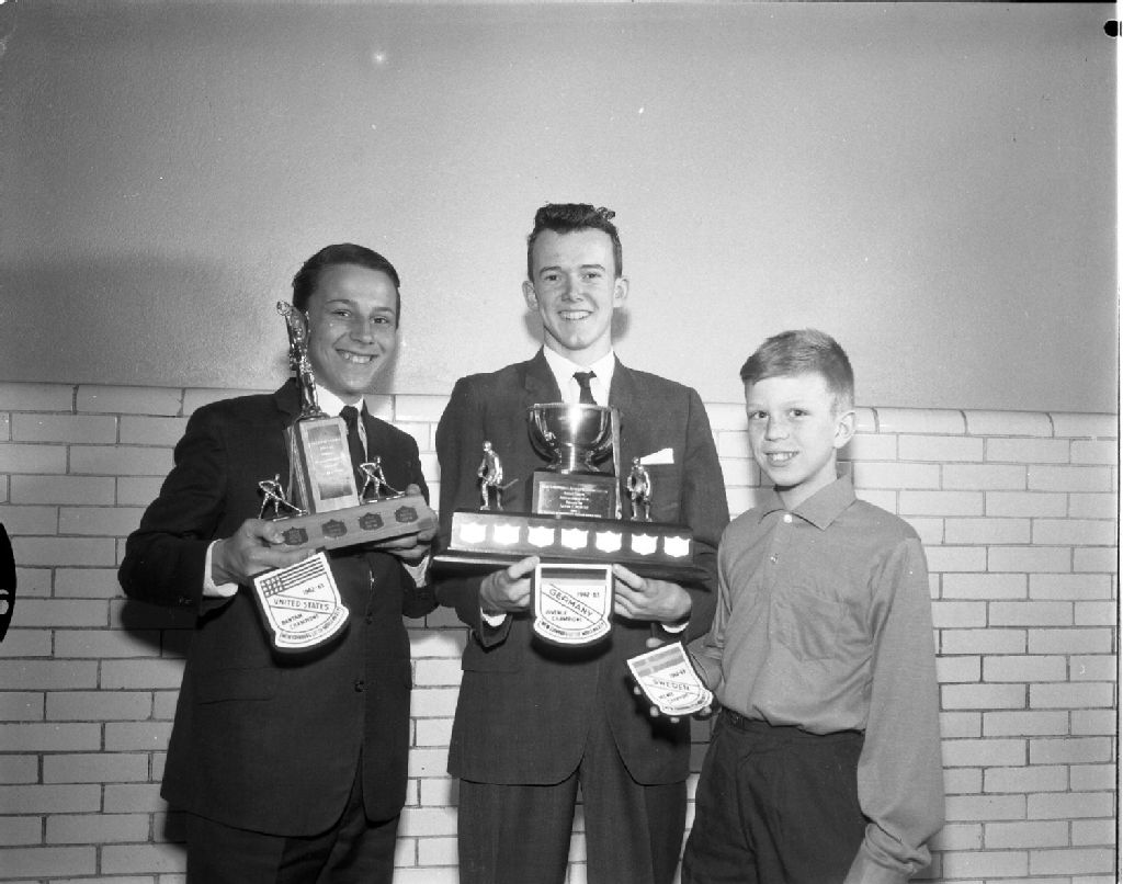 Remise de hockey à une équipe de hockey de la Ligue New Edinburgh d'Ottawa, 1962, Archives nationales à Gatineau, Fonds Champlain Marcil, (07H,P174,S1,D29761), Photographe non identifié.