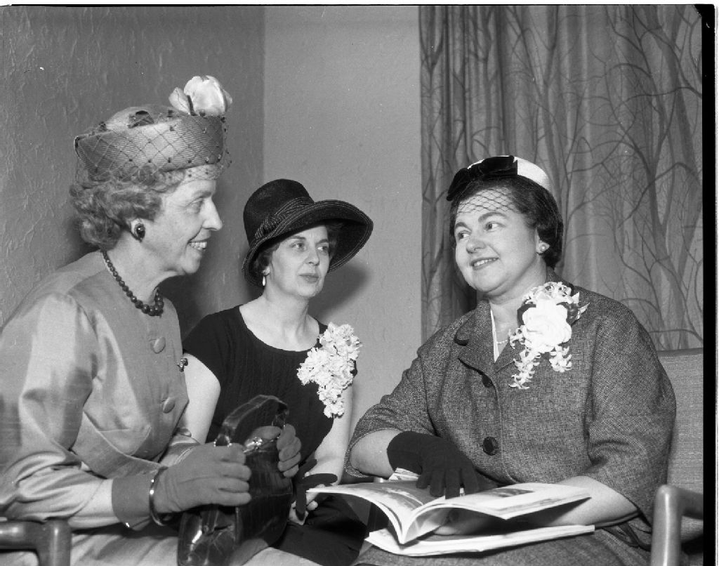 Des femmes d'affaires reçoivent Mme Labrecque de Québec, 16 mars 1963, Archives nationales à Gatineau, Fonds Champlain Marcil, (07H,P174,S1,D29847), Marcil, Champlain.
