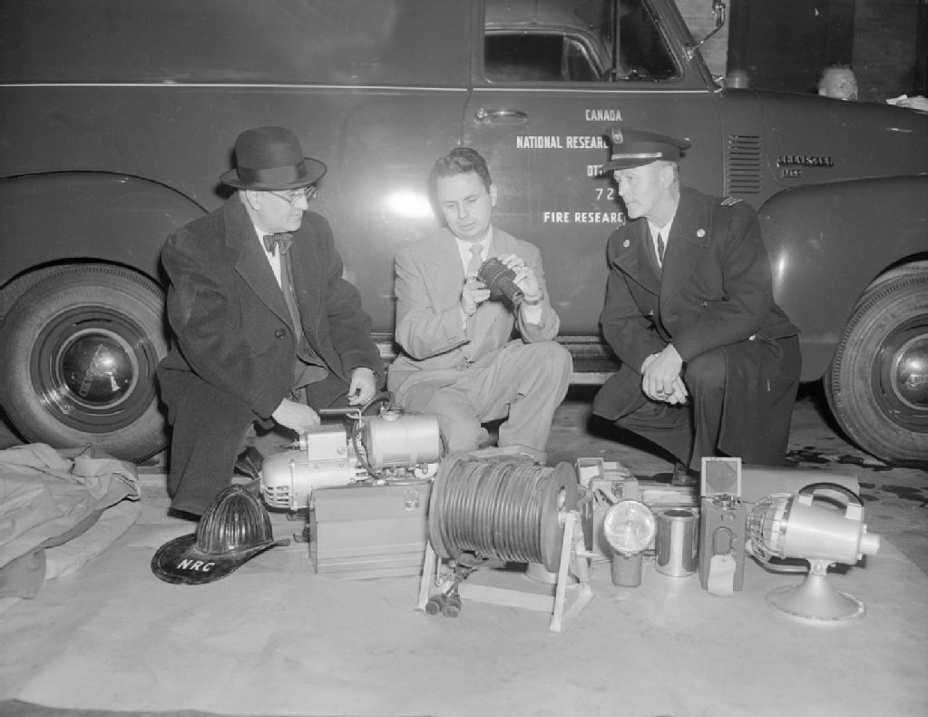 Démonstration de camions de feu aux Recherches nationales, 13 janvier 1953, Archives nationales à Gatineau, Fonds Champlain Marcil, (07H,P174,S6,D4283), Marcil, Champlain.