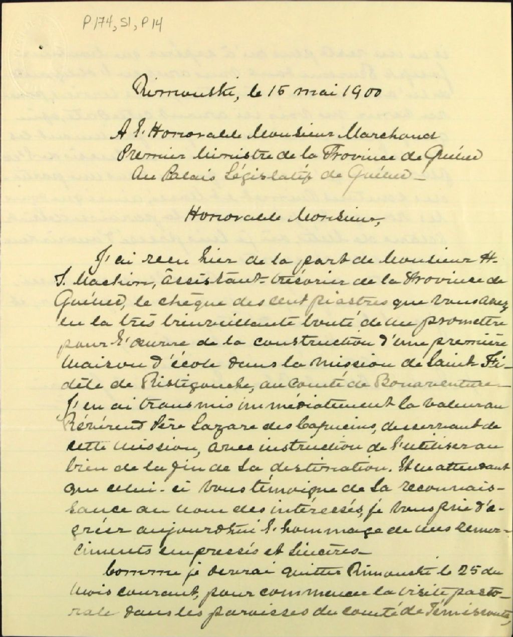 - Accuse réception avec ses remerciements, de l¿octroi du gouvernement devant servir à la construction d¿une école à la mission de Saint-Fidèle-de-Restigouche. Souhaite pouvoir rencontrer Joseph Bureau, que le gouvernement a mis à son service, avant d¿entreprendre le 25 mai, sa visite pastorale du comté de Témiscouata