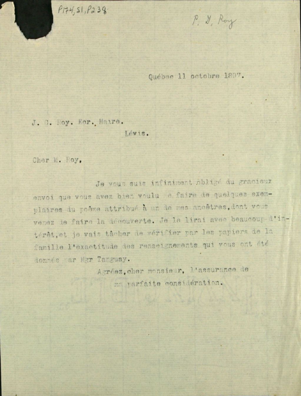 Lettre de Félix-Gabriel Marchand à Monsieur Pierre-Georges Roy, 11 octobre 1897, Archives nationales à Québec, Fonds Félix-Gabriel Marchand, (03Q,P174,S1,P238).
