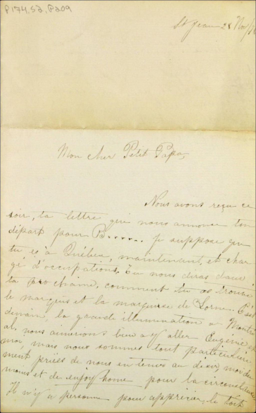 - Dans sa lettre du 28 novembre 1878, elle s¿étend longuement sur sa lecture des relations de voyages de Faucher de Saint-Maurice, disant qu¿elles lui font aimer son pays. De plus elle déclare, « ¿j¿aime mille fois mieux les romans de Mr Marmette que ceux du grand romancier français, Raoul de Navery » Elle semble expliquer cette préférence par le patriotisme. N.B. Eugénie-Caroline Saffray, dite Raoul de Navery, née à Ploërmel (Morbihan) le 27 mai 1831 et morte à La Ferté-sous-Jouarre (Seine-et-Marne) le 17 mai 1885, est une romancière française, auteur de nombreux romans empreints d'un catholicisme ardent