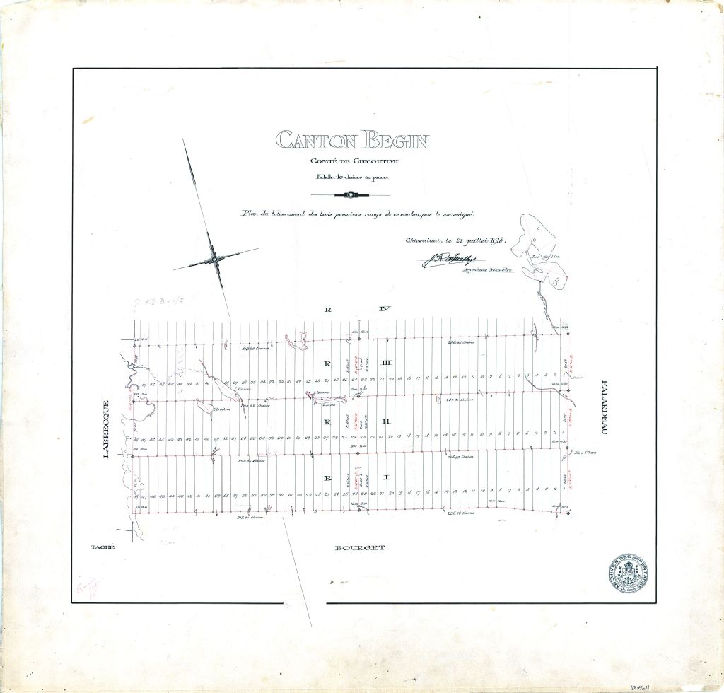 Canton Bégin. Comté de Chicoutimi. Plan du lotissement des trois premiers rangs de ce canton par le soussigné.