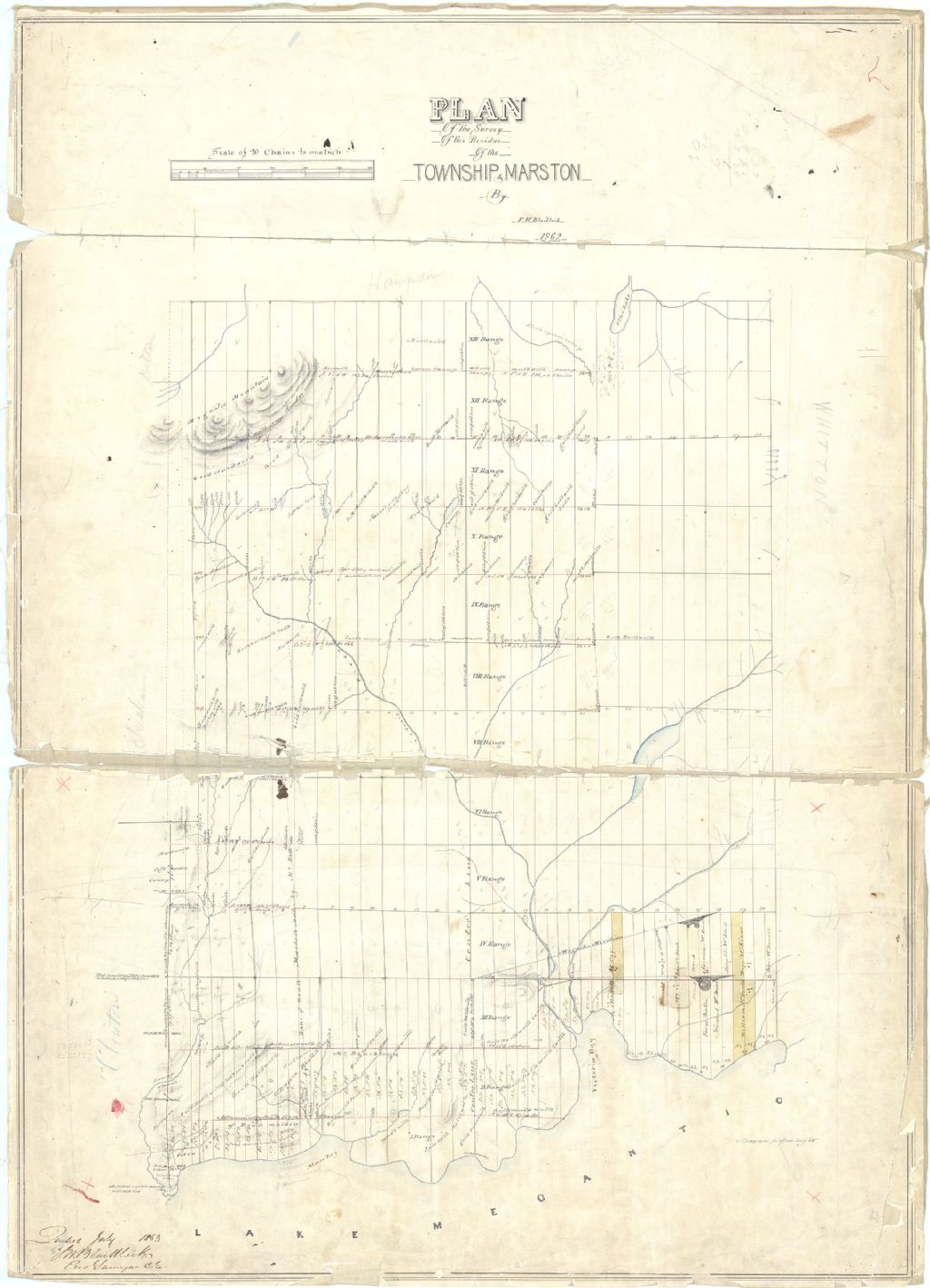 Sur ce plan relatif au canton Marston figurent le lac Mégantic entre autres, la baie Victoria, la rivière Victoria, les toponymes anglais, le numéro des lots, les bornes, les essences forestières, le relief, les ruisseaux et les marécages