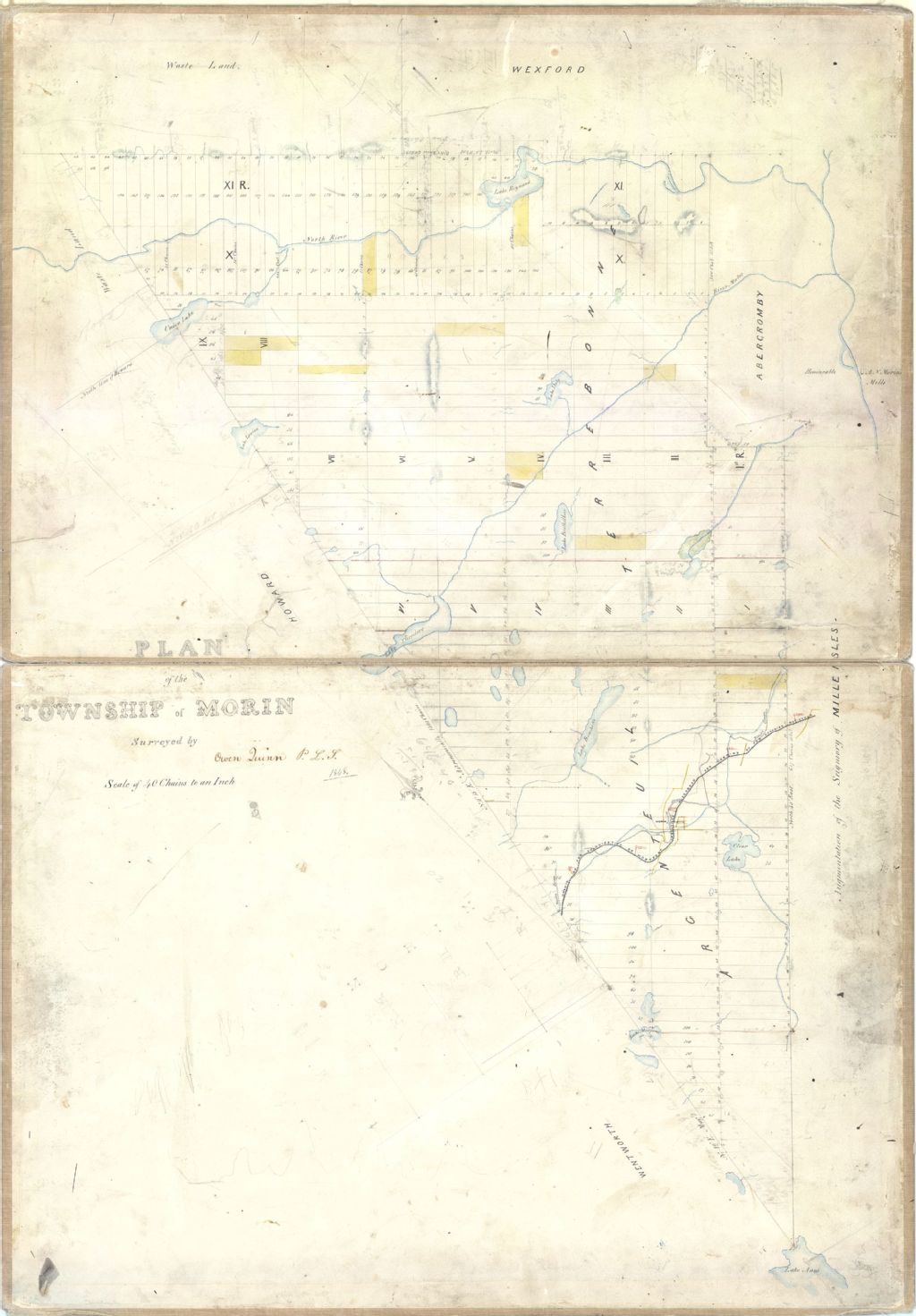 Sur ce plan d'une partie du canton Morin figurent la rivière du Nord, les lacs Morin,Union, Louise, Millette ou Daly, Bouthillier, Théodore, Bouchette, Clair, Anne et Margaret. On y retrouve également le village de Morin-Heights, le numéro des lots, la dimension des lots, les moulins, le relief, le chemin de fer et le réseau hydrographique. Figurent également sur le plan le Chemin de fer de Colonisation de Montfort et la branche Huberdeau des chemins de fer nationaux canadiens