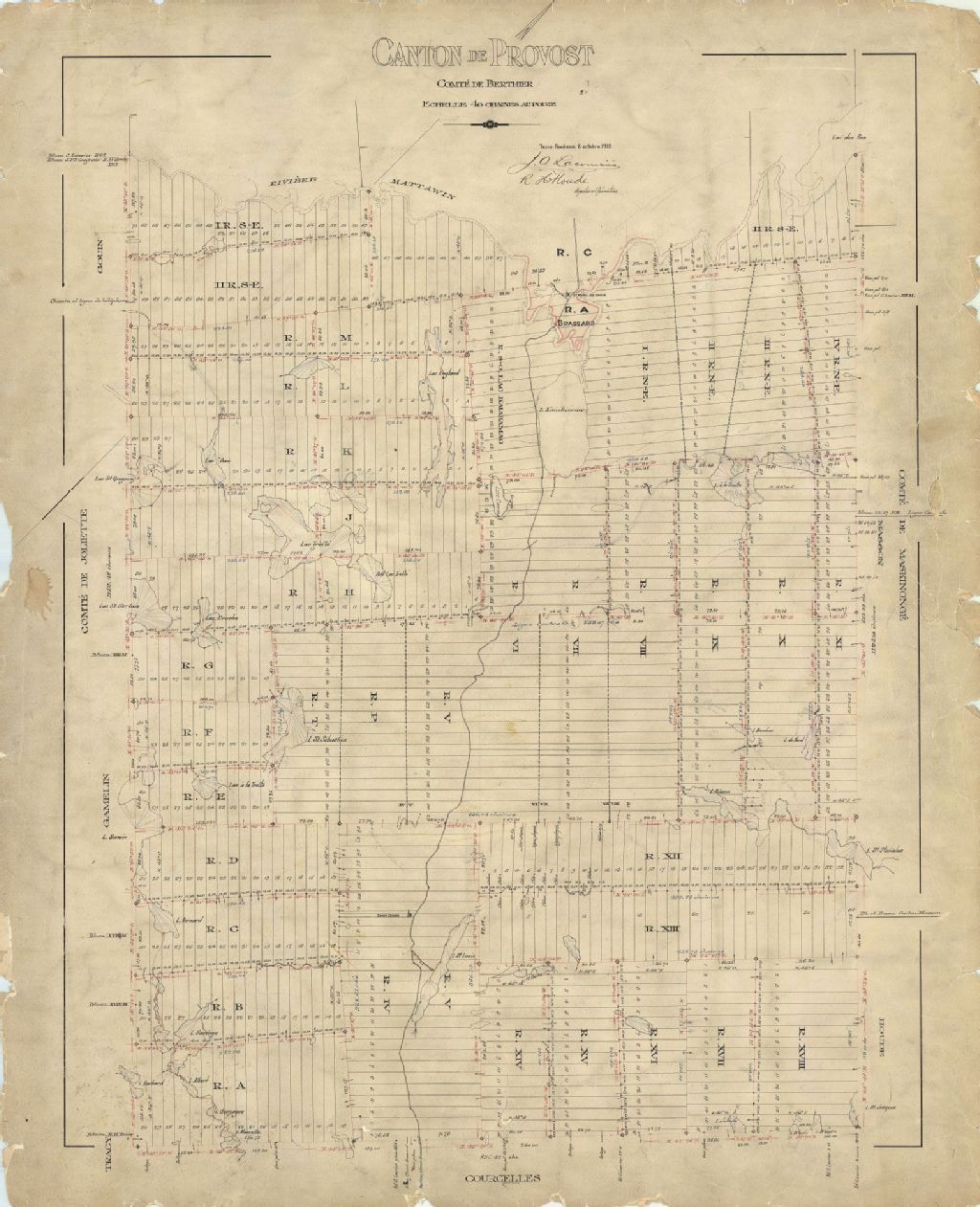 Sur ce plan du canton Provost figurent le village Saint-Zénon, le village Saint-Michel-des-Saints, la rivière Matawin, le numéro et la dimension des lots, les églises, les chemins, les bornes, les lignes d'arpentage et le réseau hydrographique