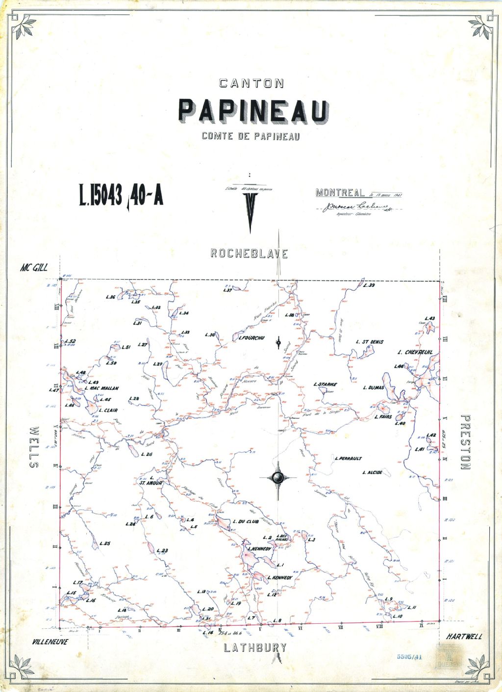 Lignes extérieures Est (Preston), Sud-Ouest (Wells) et Sud (Lathbury) avec levée de lacs et cours d'eau, canton Papineau