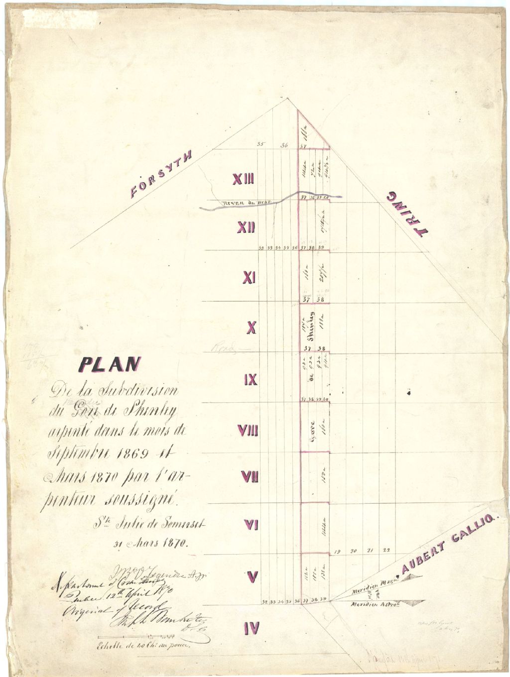 Sur ce plan d'une partie du canton Shenley figurent le bras Saint-Victor, le numéro des lots et la dimension des lots
