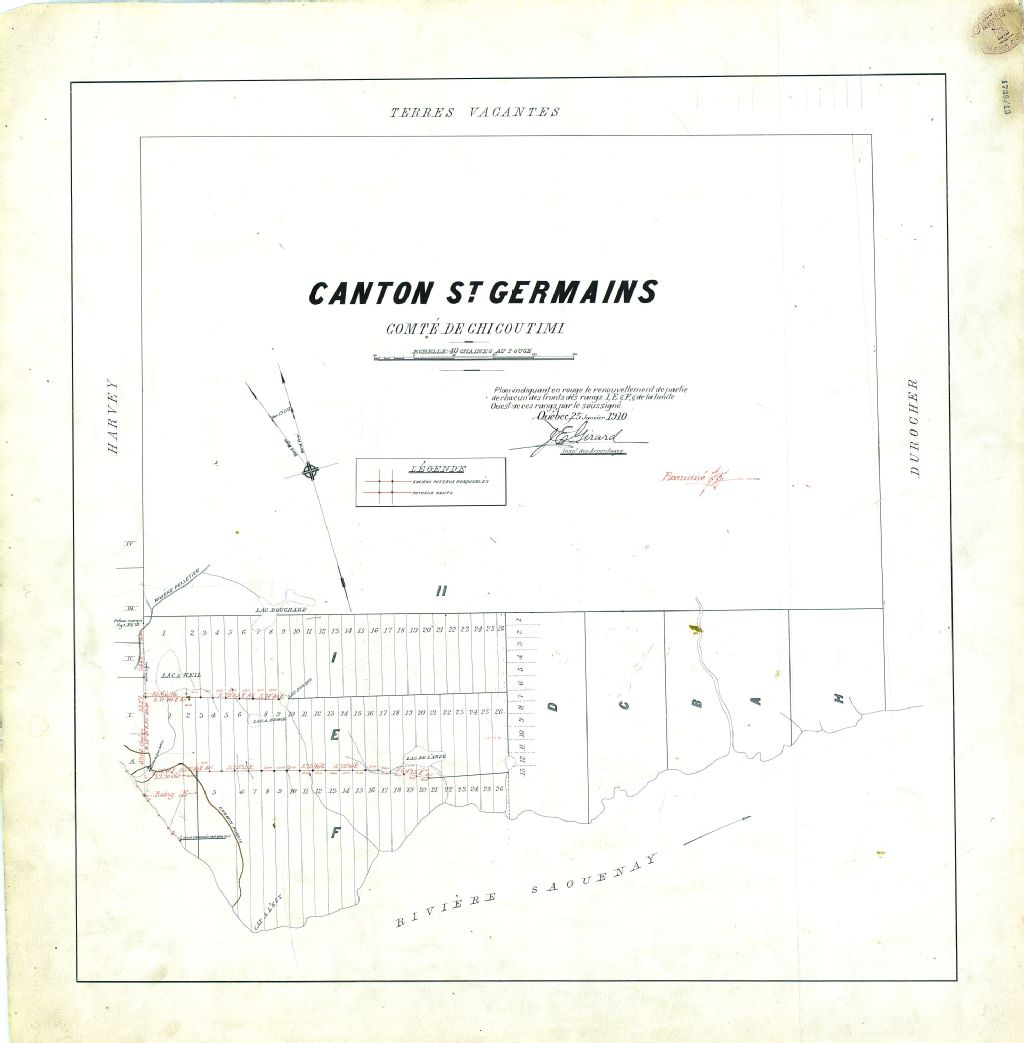 Canton St-Germains. Comté de Chicoutimi. Plan indiquant en rouge le renouvellement de partie de chacun des fronts des rangs I, E & F, & de la limite Ouest de ces rangs, par le soussigné.