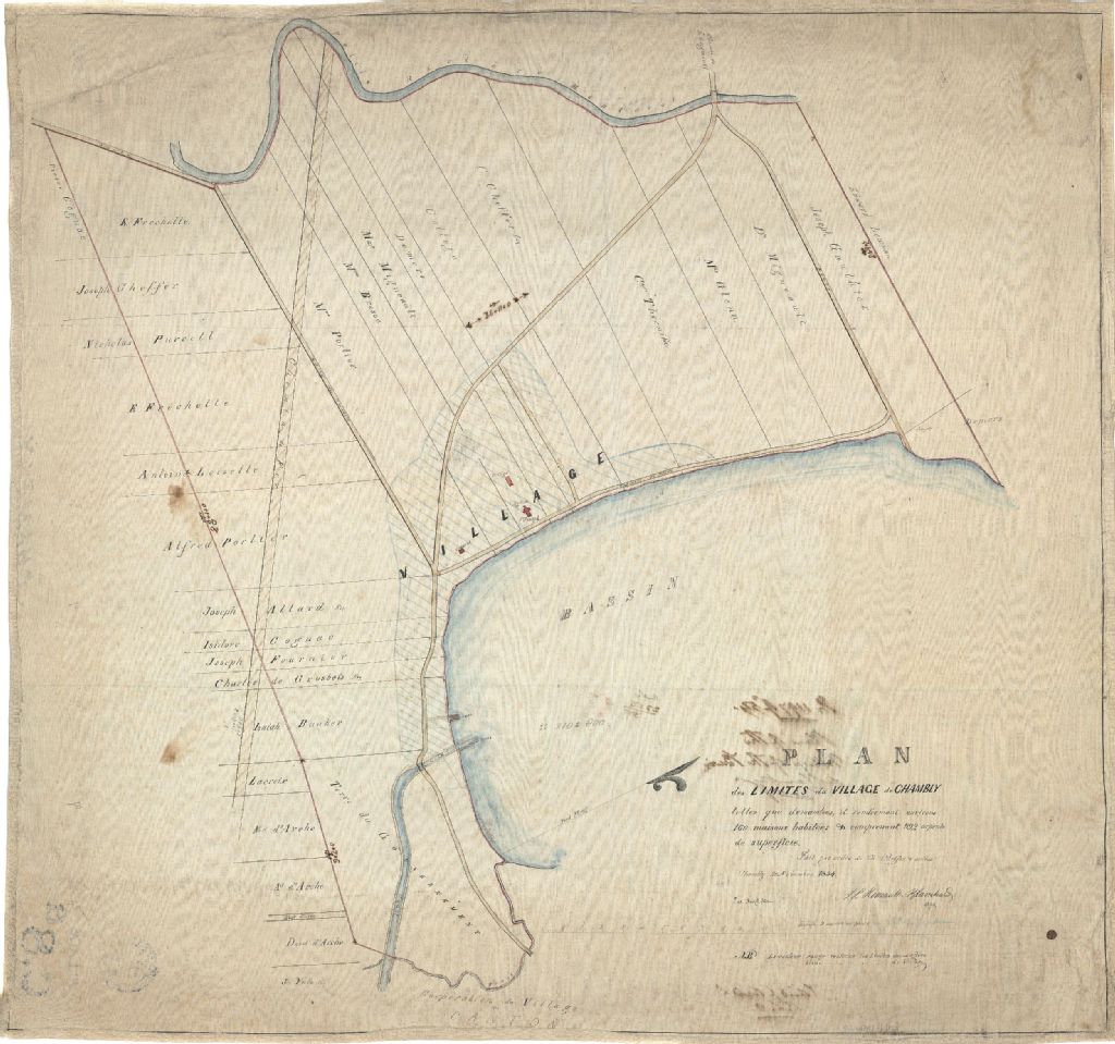 Sur ce plan d'une partie du village de Chambly figurent la rivière L'Acadie ou Montréal, le bassin de Chambly, le canal de Chambly et le chemin de Longueuil. On y retrouve également la division des lots, les chemins, les quais, les ponts, les ruisseaux, l'église, le couvent, le collège, le chemin de fer, le canal, les écluses et 28 noms de propriétaires